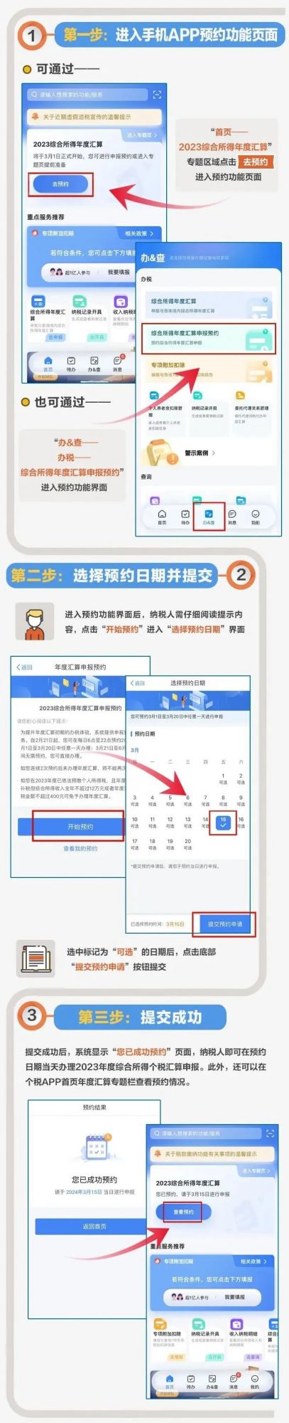 从2月21日起,有汇算初期(3月1日至3月20日)办理需求的纳税人可以根据自身情况,通过个税APP预约上述时间段中的任意一天进行办理;要在3月21日至6月30日办理的纳税人则无需预约。