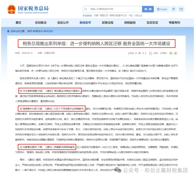为落实党的二十届三中全会精神,贯彻党中央、国务院关于加快全国统一大市场建设的决策部署,推动生产要素畅通流动,各类资源高效配置,持续优化税收营商环境,现就进一步优化纳税人跨区迁移办理服务有关事项通知如下: 税务机关要加强与市场监管部门登记信息共享,根据市场监管部门共享的跨区住所变更登记信息,通过电子税务局等渠道主动向纳税人推送跨区迁移涉税事项办理指引,提醒纳税人查询办理未办结涉税事项。对纳税人存在未办结涉税事项的,同步向税务人员推送限时办理提示,督促限时办结。 (一)优化未结事项办理。申请跨区迁移的纳税人存在未办结涉税事项的,对依纳税人申请办理的事项,即时推送纳税人确认是否继续办理,纳税人选择继续办理的,税务机关应限时办结;纳税人选择不再办理的,税务机关应立即终结该涉税事项。对税务机关依职权发起的事项,按规定限时办结。 (二)简化发票使用手续。对使用全面数字化的电子发票的纳税人,信息系统自动将其发票额度转至迁入地。纳税人使用税控设备的,在省内迁移时,可线上变更税控设备信息,无需在迁出地税务机关缴销税控设备;在跨省迁移时,可线上远程注销税控设备,直接向迁入地税务机关领用税控设备,或使用全面数字化的电子发票。 (三)分类处理涉税风险。纳税人存在未完成风险任务的,税务机关对低风险的即时办理迁移手续,将风险任务推送至迁入地税务机关继续处理;税务机关对中、高风险的按规定限时完成风险应对,及时办理迁移手续。 (四)优化退税办理环节。纳税人存在多缴税款的,信息系统自动提醒办理退税,对选择在迁移前办理退税的,税务机关应限时办理;对选择暂不退税的,税务机关辅导纳税人在迁移后办理退税。 迁入地税务机关要提供“一站式”迁入服务,保障纳税人纳税信用级别、发票额度、预缴税款、所得税亏损弥补、增值税一般纳税人资格、未抵扣增值税进项税额等权益和资质得以延续,并及时辅导纳税人办理迁移前未办结的涉税事项。 各级税务机关要坚决贯彻落实党中央、国务院决策部署,依法发挥税收职能作用,持续优化纳税人跨区迁移服务,坚决抵制地方保护主义,严禁协助阻拦纳税人正常迁移,严禁违规发起风险任务阻断纳税人迁移,严禁额外增设条件门槛阻碍纳税人迁移。对于违规阻碍纳税人跨区迁移的文件和要求,一律不得执行,并及时向上级税务机关报告。对纳税人跨区迁移违规设置障碍的税务机关及相关责任人员,依规依纪严肃处理。 本通知自2024年9月1日起执行,执行中遇到重大问题的,及时向国家税务总局(征管和科技发展司)报告。